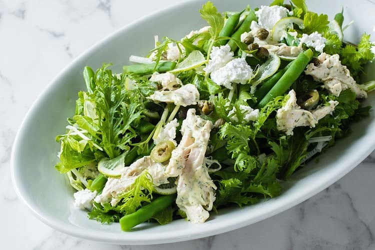 柔らかく蒸した鶏胸肉を、ディルとセルフィーユ入りのハーブマヨネーズで和え、ワサビ菜、ホワイトセロリなどの野菜と一緒にお召し上がりいただくボリュームサラダです。ライムやケッパーの酸味が効いています。