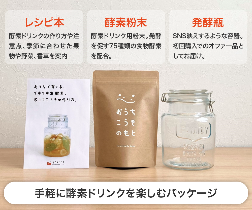 株式会社キカクニカの提供する、ユーザーがお好みのフルーツで、生きた酵素ドリンクを作れるよう工夫を施した「おうちこうそ」は、粉末とレシピ本、専用発酵瓶をパッケージ化したもので、販売開始からInstagramなどの口コミで品薄状態となるなど、上々の滑り出しを見せています。