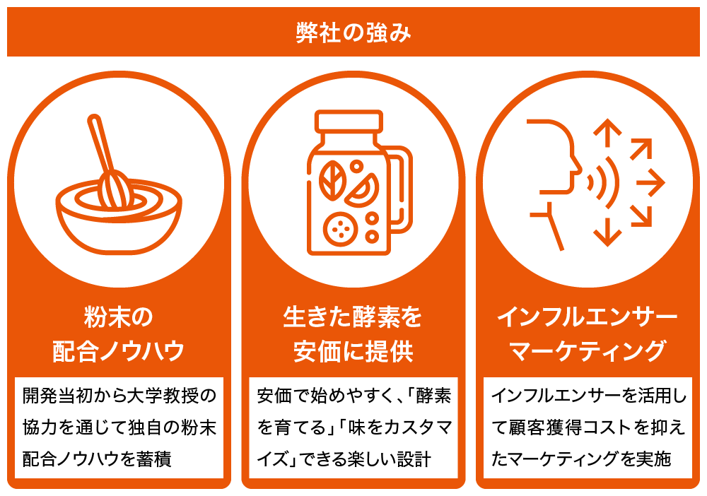 キカクニカ最大の差別化要素は、大学と連携して酵素ドリンク用粉末を独自開発している点です。「生きた酵素」を第一にした、こだわりの配合バランスと品質が弊社のビジネスモデルの中核となっております。すでにフォロワー約6,000人を獲得し、Instagramを起点にしたD2Cモデルとインフルエンサー活用による販路拡大をしております。さらに発酵食品に関する知見を持つ大学教授との共同研究により、各種エビデンスの取得を進め、ブランド力を強化してまいります。
