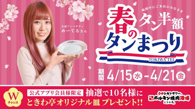 実施期間:2022年4月15日(金)~4月21日(木) 実施店舗:「0秒レモンサワー®仙台ホルモン焼肉酒場 ときわ亭」 計23店舗 実施内容:期間中、公式アプリ会員限定で、タン商品7種を半額でご提供。 さらに、期間中、キャンペーン実施店舗で来店スタンプを押して頂いたお客様にアプリメッセージにて応募フォームを送信。ご応募頂いたお客様の中から抽選で10名様に『ときわ亭ホルモン専用皿』をプレゼント致します。 ※当キャンペーンは予告なく中止する場合がございます。 |