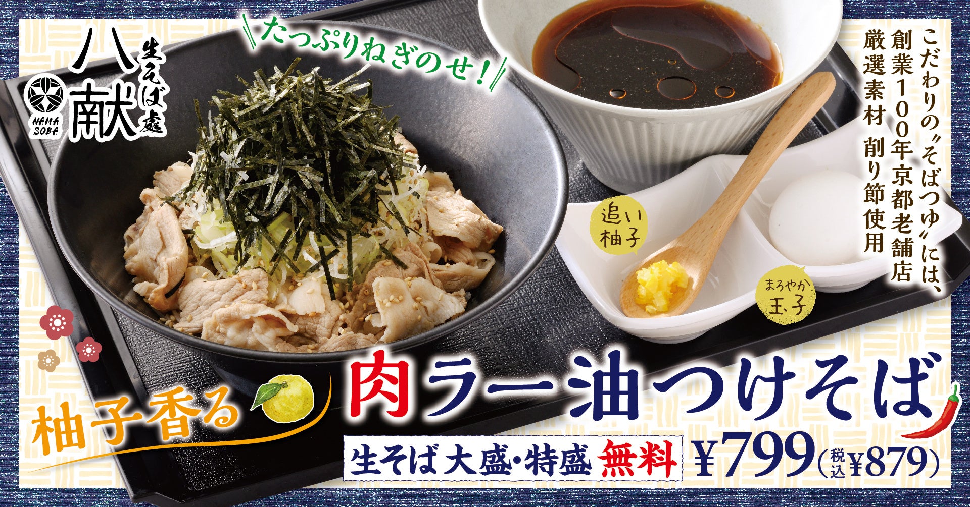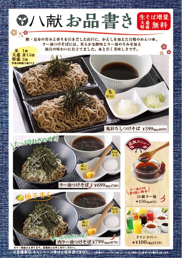 ニラックス株式会社(本社:東京都武蔵野市、代表取締役:崎田 晴義)が運営する “デリシュー成田店”にて大人気の『生そば處 八献』より、コスパ最強の単品メニューが新登場!