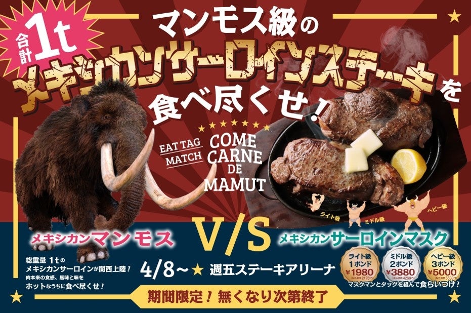国内外で飲食事業を展開する株式会社KICHIRI(本社:渋谷区、代表取締役社長:平田 哲士)が運営する、ルクア大阪B2階「キッチン&マーケット」内の厚切りでガッツリと肉本来の味を堪能できる『週五ステーキ』は、2022年春の目玉となる“マンモス級の3ポンドメキシカンサーロインステーキ”を2022年4月8日(金)より期間限定で発売します。