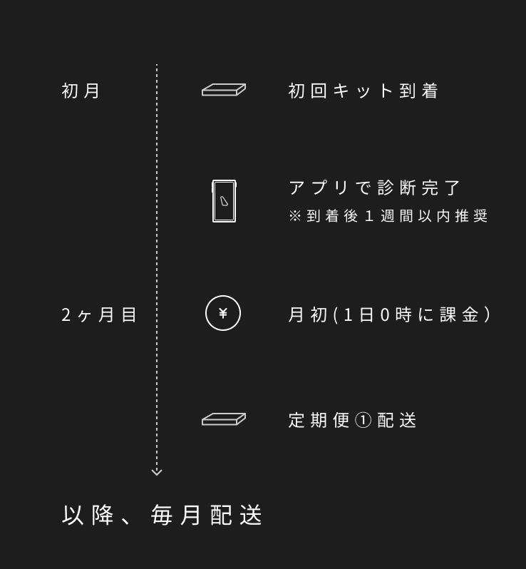 公式ページより会員登録をしていただくと、ご自宅に「サケタイプ診断キット」が届きます。初月は、「サケタイプ診断キット」にて、サケタイプ診断を行っていただき、2ヶ月目以降は、その診断結果をもとに、毎月異なるエリアの日本酒をお届けします。