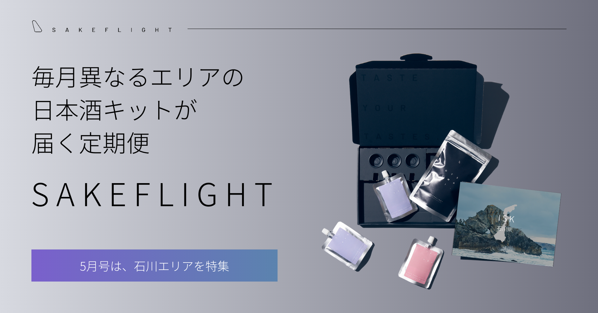スマホアプリであなたの”サケタイプ”を診断し、パーソナライズされた日本全国の地酒が届く、日本酒の定期便サービス『SAKEFLIGHT(サケフライト)』を展開するYUMMY SAKE株式会社(所在地:東京都台東区蔵前3-9-3 / 代表取締役:山本祐也)は、『SAKEFLIGHT』5月号にて【石川エリア】の日本酒体験をお届けすることをお知らせします。