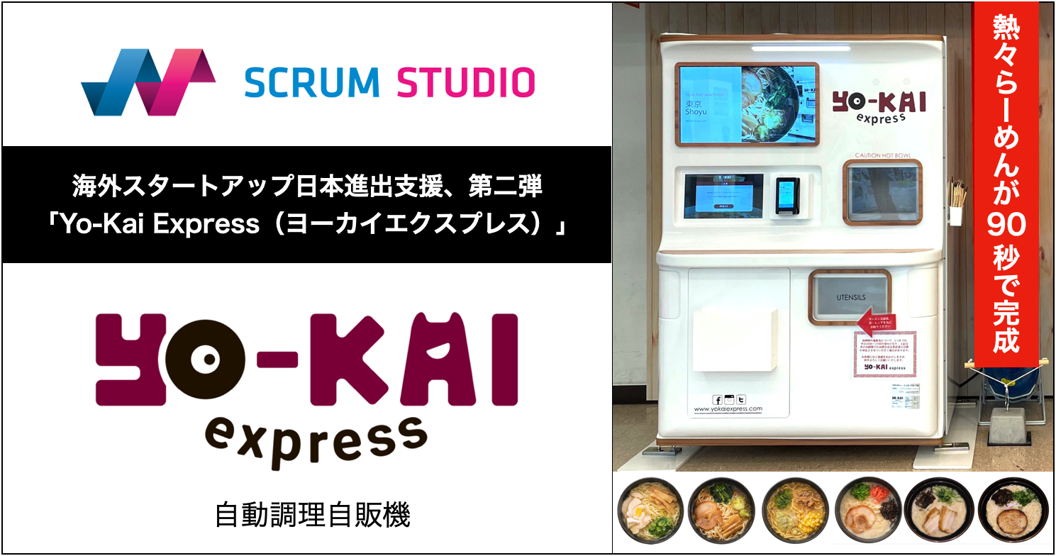 出来たてのラーメンが買える自動調理自販機を開発している「Yo-Kai Express」は、スクラムスタジオが運営するグローバル・オープンイノベーション・プログラム 『Food Tech Studio – Bites!』に参加し、世界30ヵ国218社の応募者の中から、85社の採択スタートアップの1社に選ばれました。このプログラムの日本側のパートナーであるJR東日本とヴィジョンを共有し、日本展開について議論を深め、同社が運営するキッチン付きコワーキングスペース「K, D, C,,,」(新大久保駅直上)に海外スタートアップ第一号として入居。「K, D, C,,,」に日本支社を登記し、日本でのサービス開始に向けてスクラムスタジオとともに準備を進めてきました。