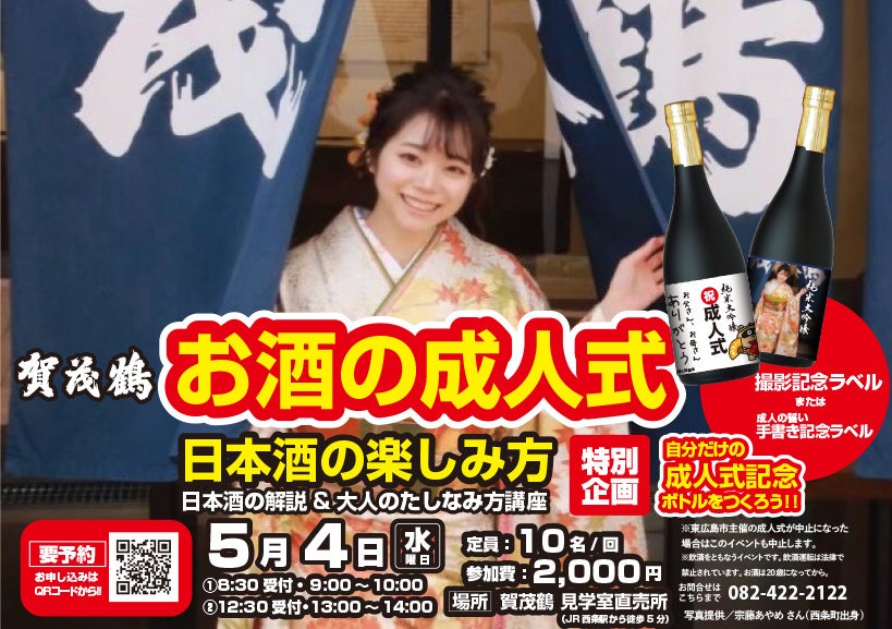 賀茂鶴酒造㈱(広島県東広島市西条、代表取締役社長:藤原昭典)は、 2022年5月4日(水)、広島県東広島市主催の「成人を祝う会(成人式) 」の開催にあわせて、20歳以上を対象に「第2回お酒の成人式」を開催 します。