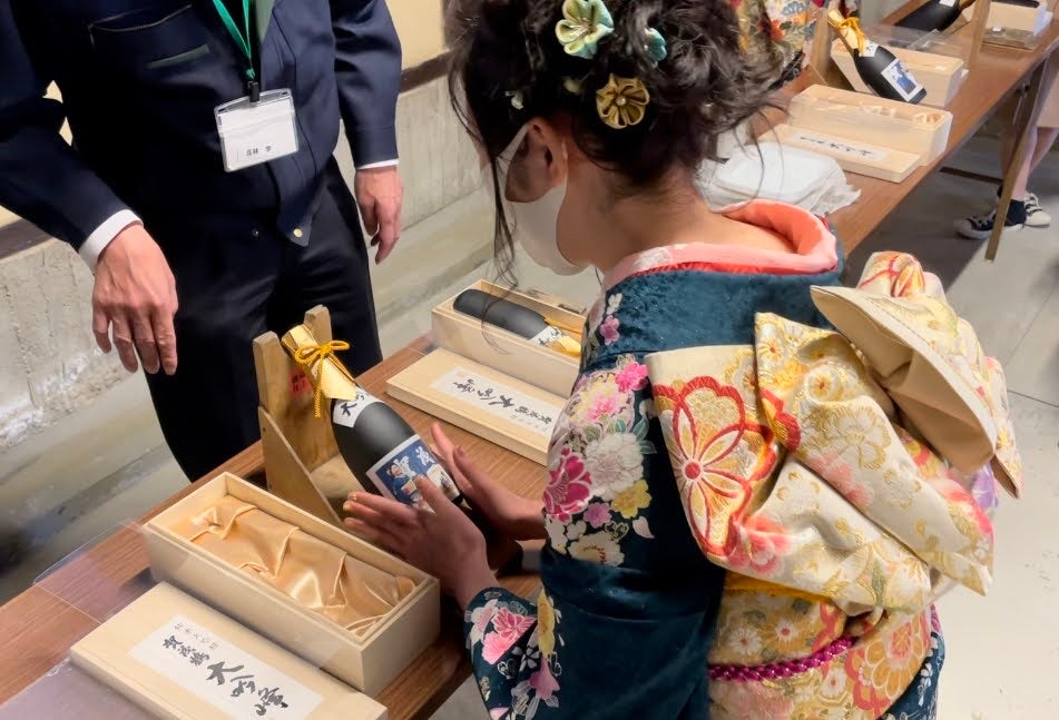 酒蔵を背景に撮影した晴れ着姿のお写真あるいは、手書きのメッセー ジ入りオリジナルラベルの記念酒(純米大吟醸酒)を自分だけのとって おきのお土産としてお持ち帰りになれます。