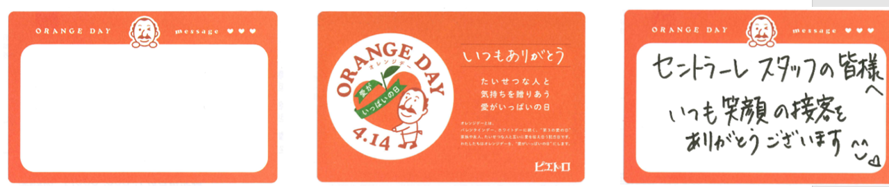 たいせつな方へ気持ちを贈るツールとして、メッセージカードもご用意いたしました。 オレンジデーのギフトセットやピエトロの店舗にて、お渡しをしております。