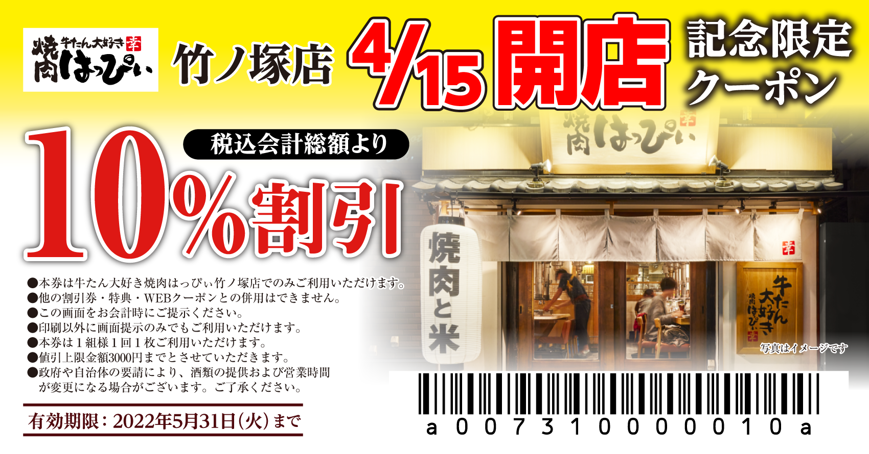 オープン記念として、2022年5⽉31⽇(火)まで『牛たん大好き焼肉はっぴぃ竹ノ塚店』でご利⽤いただける10%割引クーポンを配布します。