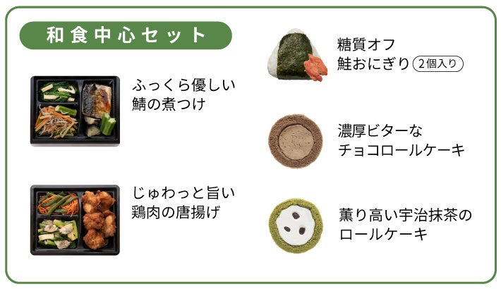サバの煮つけや唐揚げなど、ごはんが進むおかずメニューのほか、宇治抹茶のロールケーキなど和のスイーツを盛り込んだ和食メイン5 品のセット。