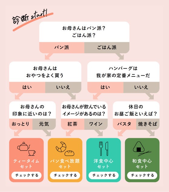 「お母さんの好きなもの診断」は、「はい・いいえ」や「パン派?ごはん派?」など、2 択形式の質問に計3 回答えるだけで診断結果が導かれ、お母さんの好みにぴったりなギフトセットを4 種類から選んでいただける内容になっています。