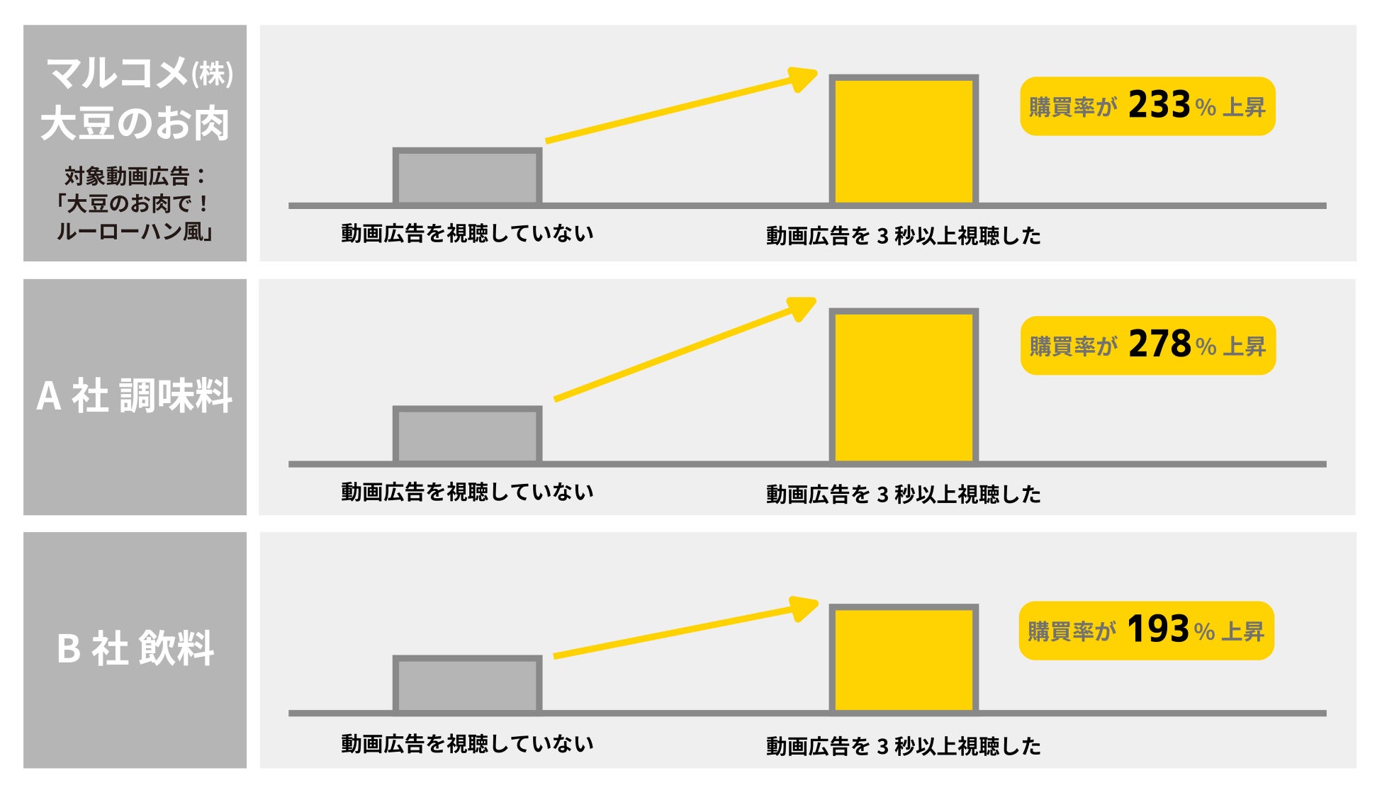『DELISH KITCHEN CONNECT』のオフライン購買検証サービスを先行導入したマルコメ(株)と他2社では、タイアップを行ったレシピ動画広告と同期間のレシートデータを照合した結果、動画広告を3秒以上視聴したユーザーは、動画広告を視聴していないユーザーと比較すると約2倍以上高い購買率となることがわかりました。