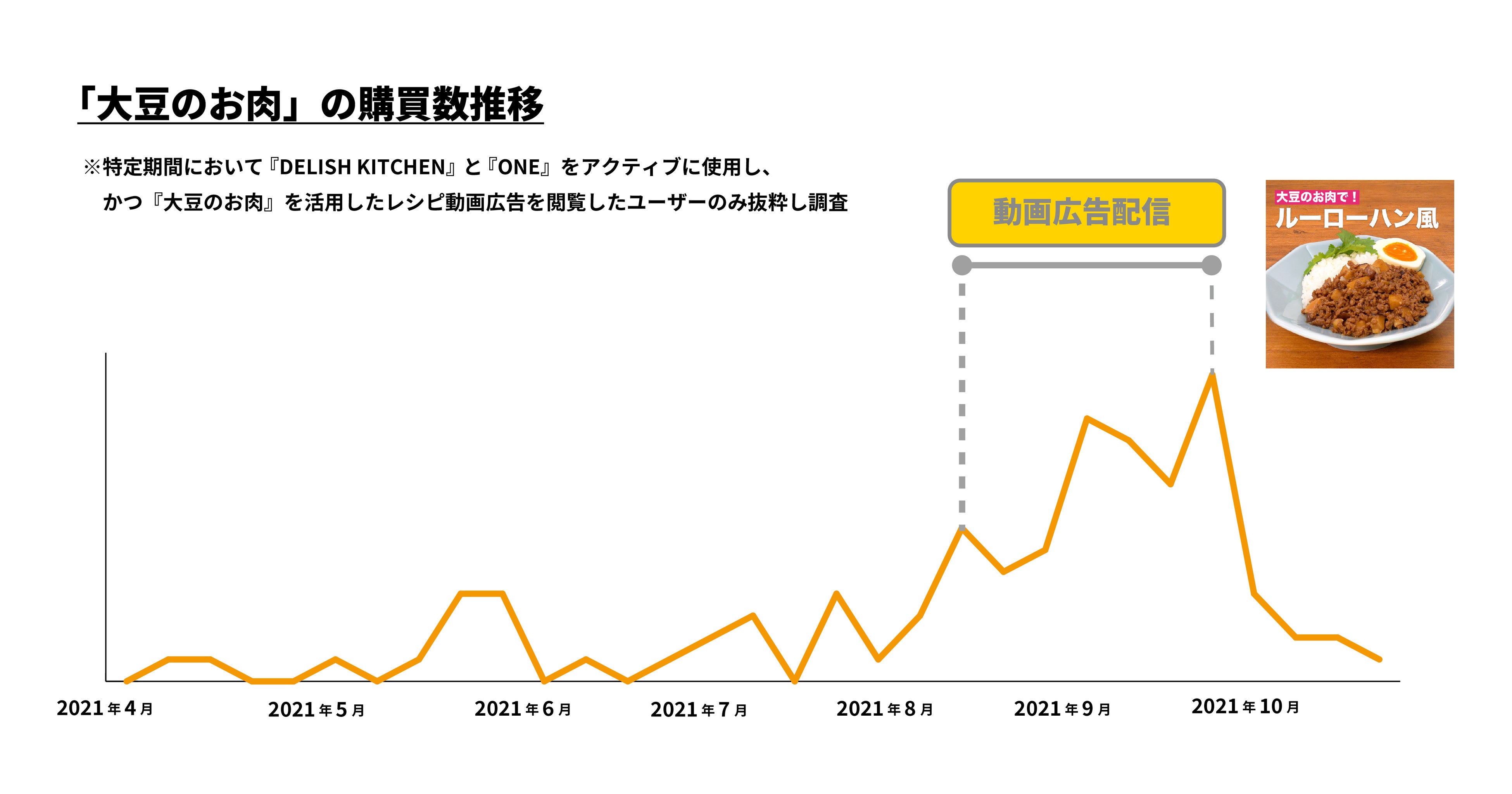 マルコメ(株)の商品「大豆のお肉」では、2021年4月から2021年10月の購買数の推移を検証。『DELISH KITCHEN』で制作した「大豆のお肉」のタイアップ動画広告「ルーローハン風」のレシピ動画を2021年8月17日から10月1日の期間に『DELISH KITCHEN』 アプリ内でパーソナライズ配信を実施すると、同期間に購買数が大幅に上昇しました。