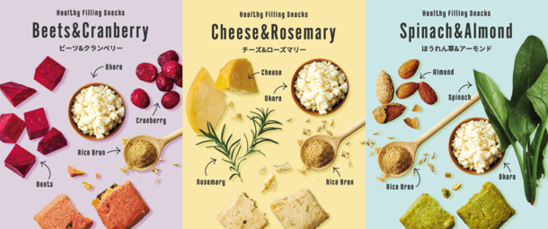 新ブランドの第一弾「Healthy Filling Snacks OKARA×RICE BRAN」は、大麦粉、おから、米ぬかをベースに、野菜やハーブ、ナッツ、チーズなどを練り込んだ、6種6色のクッキーです。