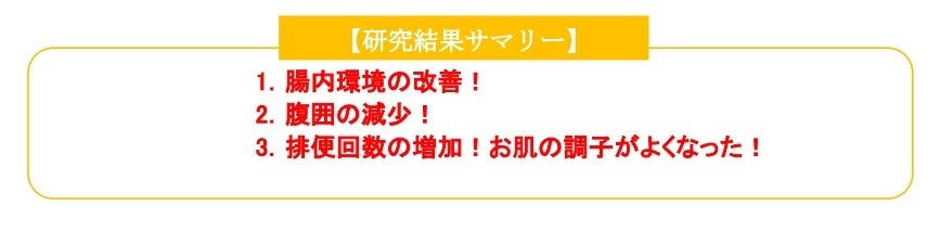 3. 排便アンケートとお肌の調子アンケートの数値が摂取後で有意に増加し、便通と肌の調子が改善する 可能性が示唆された。