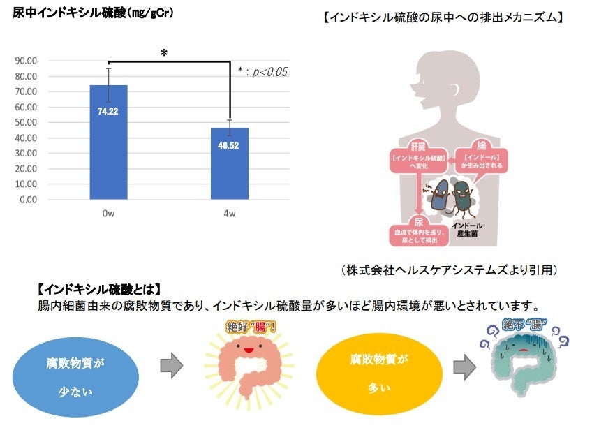 1. 腸内環境検査尿中インドキシル硫酸を測定した結果、摂取後で有意に減少したため、腸内環境が改善され た可能性が考えられる。