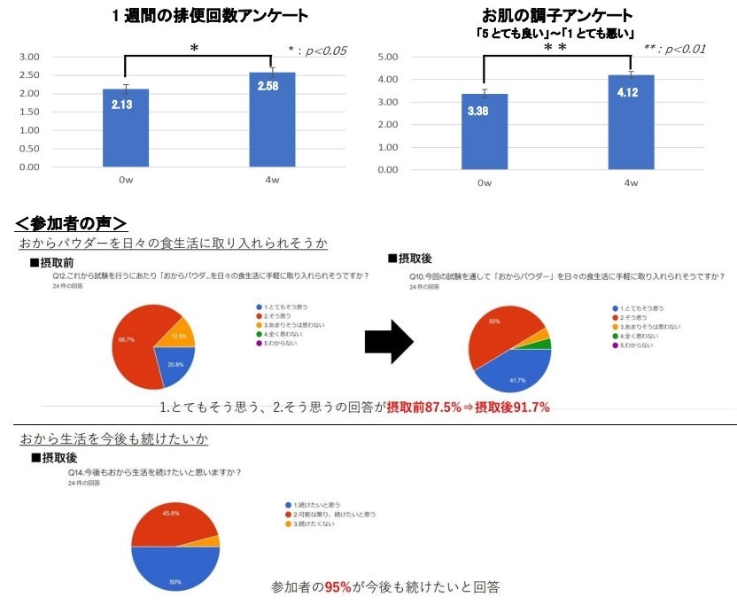 おからパウダーの継続摂取により、腸内環境を改善し便通を改善する効果、ウエストを細くする効果、肌の調子 を良くする効果がある可能性が示唆された。 今回の試験は単群試験の結果であり、今後比較対象を置いた試験や人数・項目など増やした試験を行い詳細な 研究を続けていく予定です。
