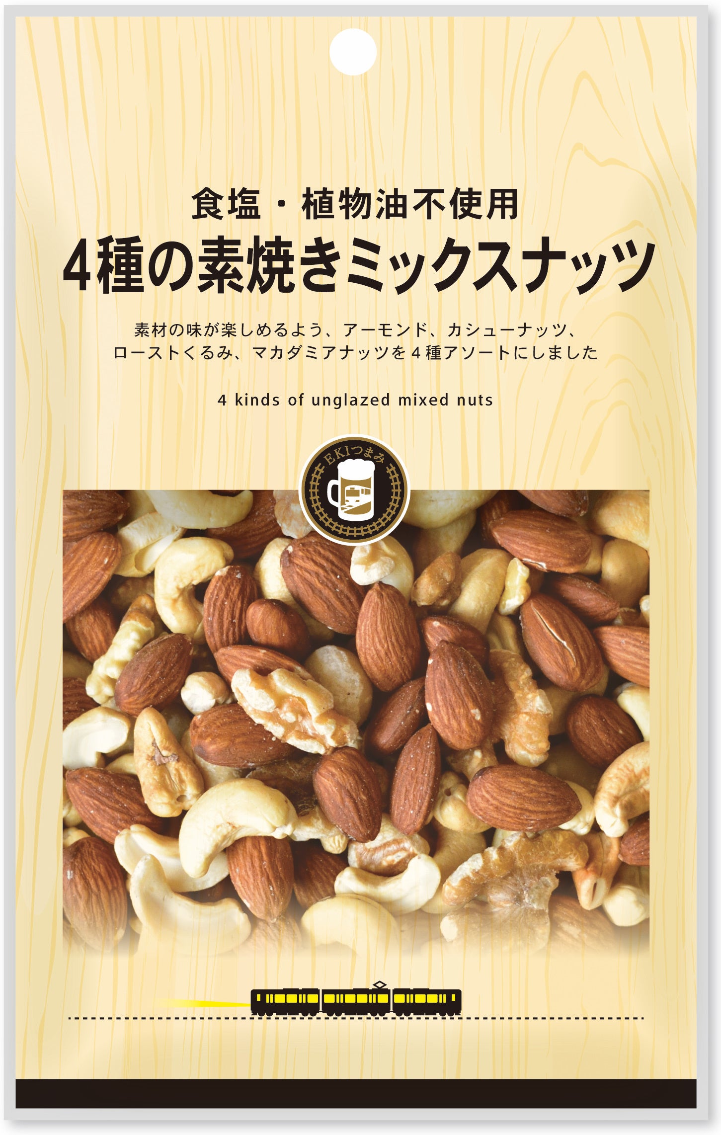素材の味が楽しめるよう、アーモンド、カシューナッツ、ローストくるみ、マカダミアナッツを4種アソートにしました。