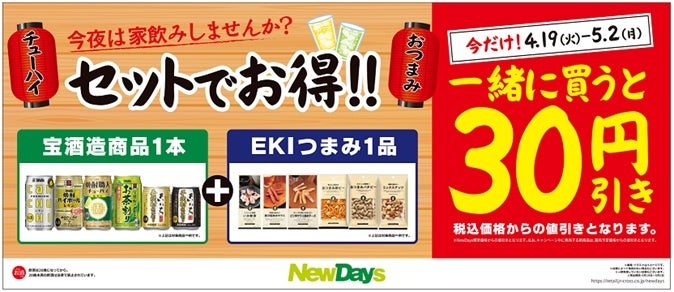◆4月19日(火)から5月2日(月)の期間、NewDaysで宝酒造商品1本とEKIつまみ1品を一緒に買うと30円引き!