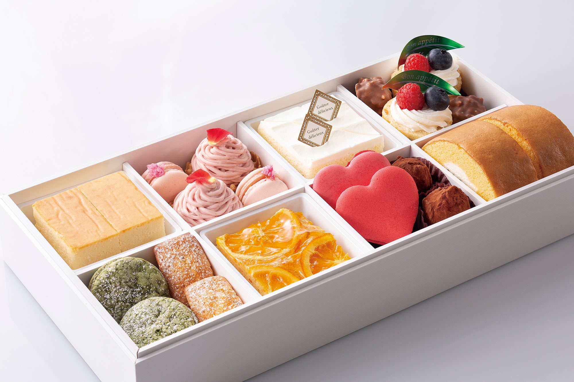 メニュー内容:ベイクドチーズケーキ、季節のマカロン、季節のモンブラン、フレジェ(苺のショートケーキ)、フルーツカップケーキ、ボンボンショコラ、抹茶のダックワーズ、トンカ豆のマドレーヌ、オレンジの焼き菓子、ハートのマカロン、ローズマリー香るトリュフ、濃厚しっとりロールケーキ(または 季節のロールケーキ)、オリジナルメッセージプレート