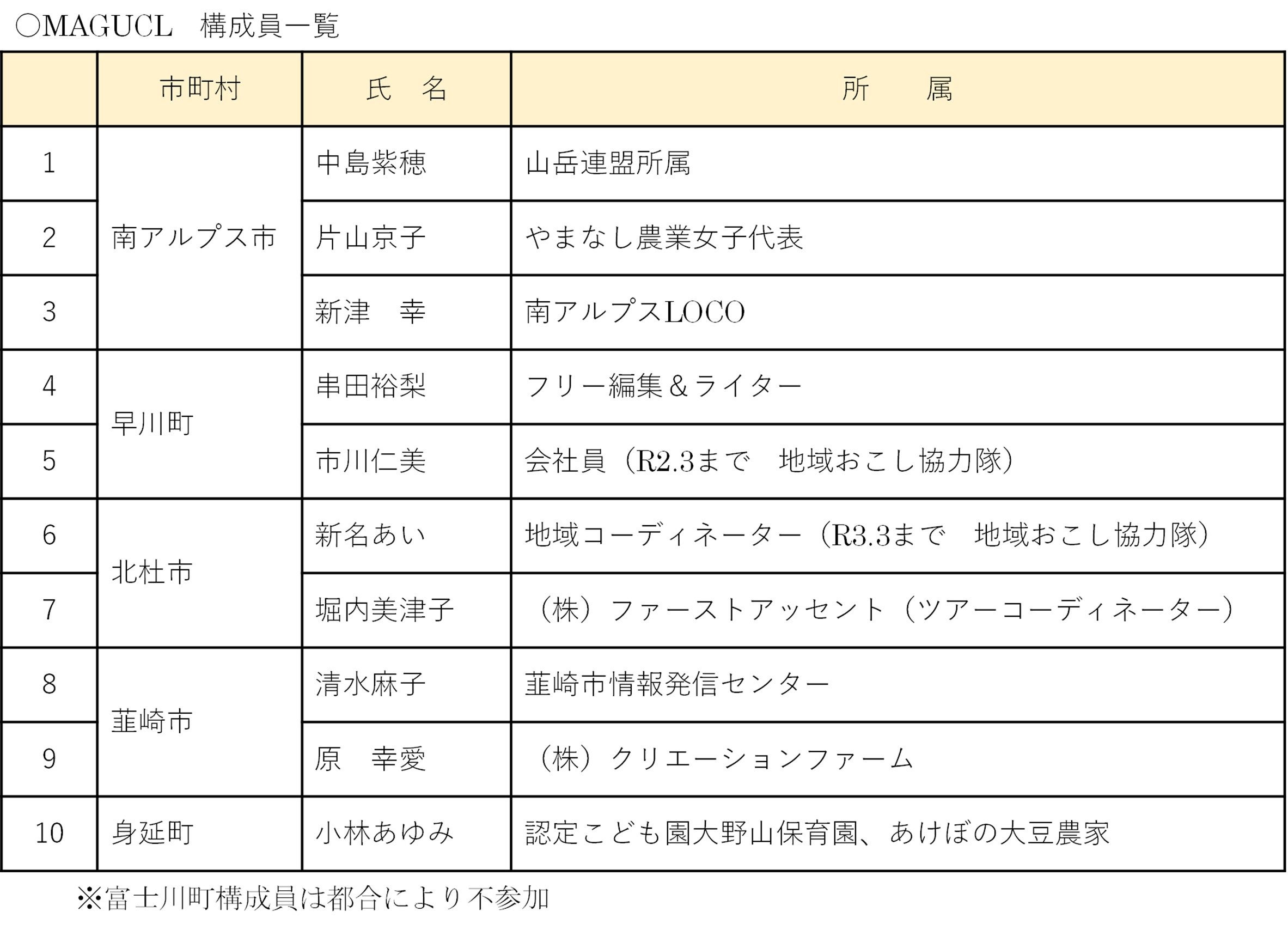 南アルプス地域(北杜市、韮崎市、南アルプス市、富士川町、早川町、身延町)で活躍する地元の女性による商品開発チームMAGUCL組織を形成するため、各市町村からの推薦によりMAGUCL(構成員:10名)を組織しました。