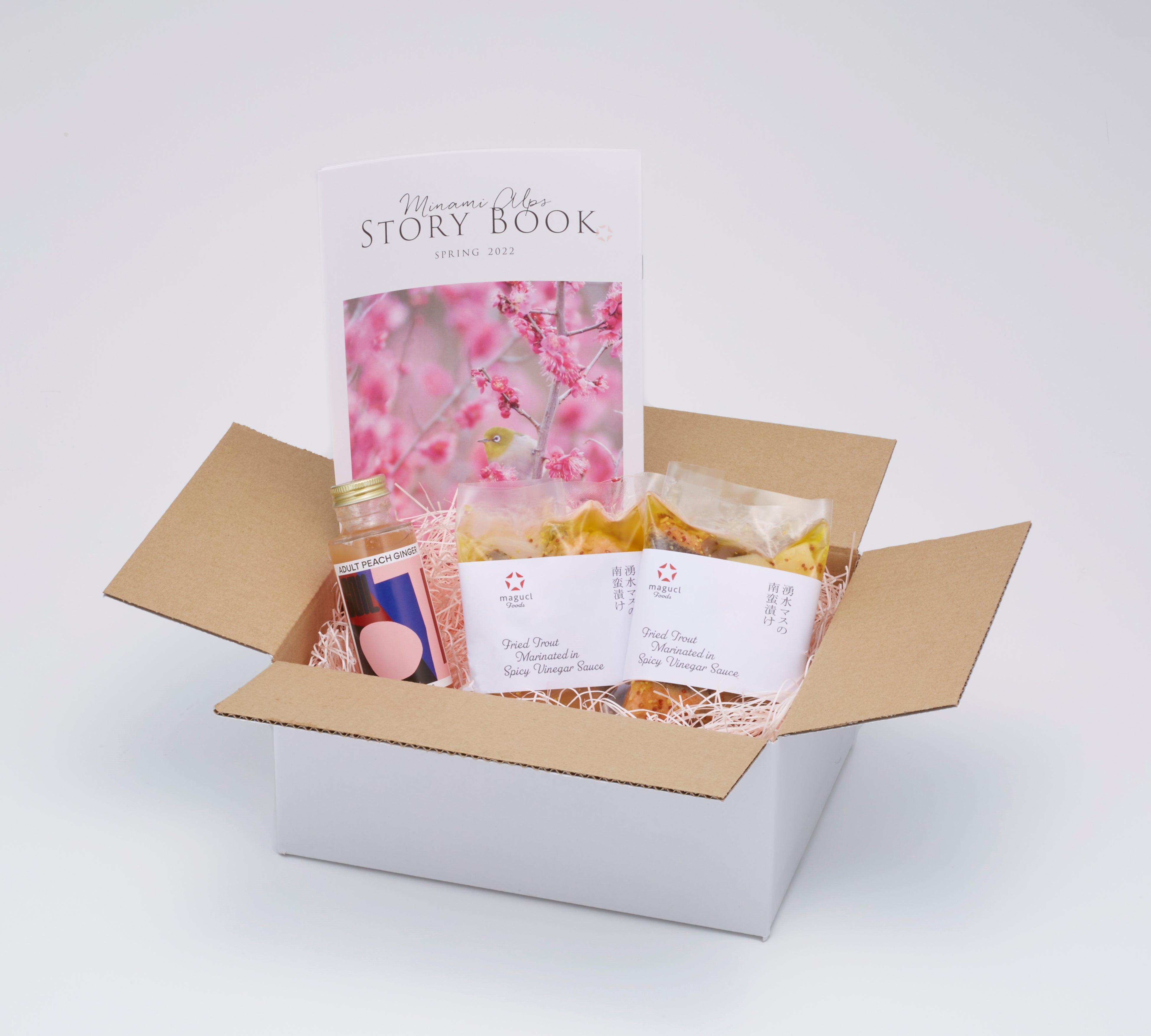 季節に応じた『地域の特産品を活用した逸品』と『地域在住の有名ソムリエが選んだお酒』、地域の魅力をより深く知ることができる、オリジナル冊子『ストーリーブック』をセットにしてお届けします。
