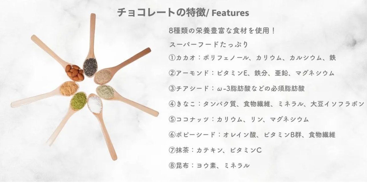 チョコレートの原料のカカオ豆に加え、アーモンド、きなこ、チアシード、ココナツ、ケシの実、抹茶、昆布などの栄養たっぷりの食材をふんだんに使用し、栄養価を最大まで高めた完全食チョコレート。