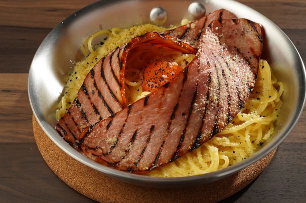 大判のベーコンをふんだんに使用し、豪快にかぶりついて食べるカルボナーラ