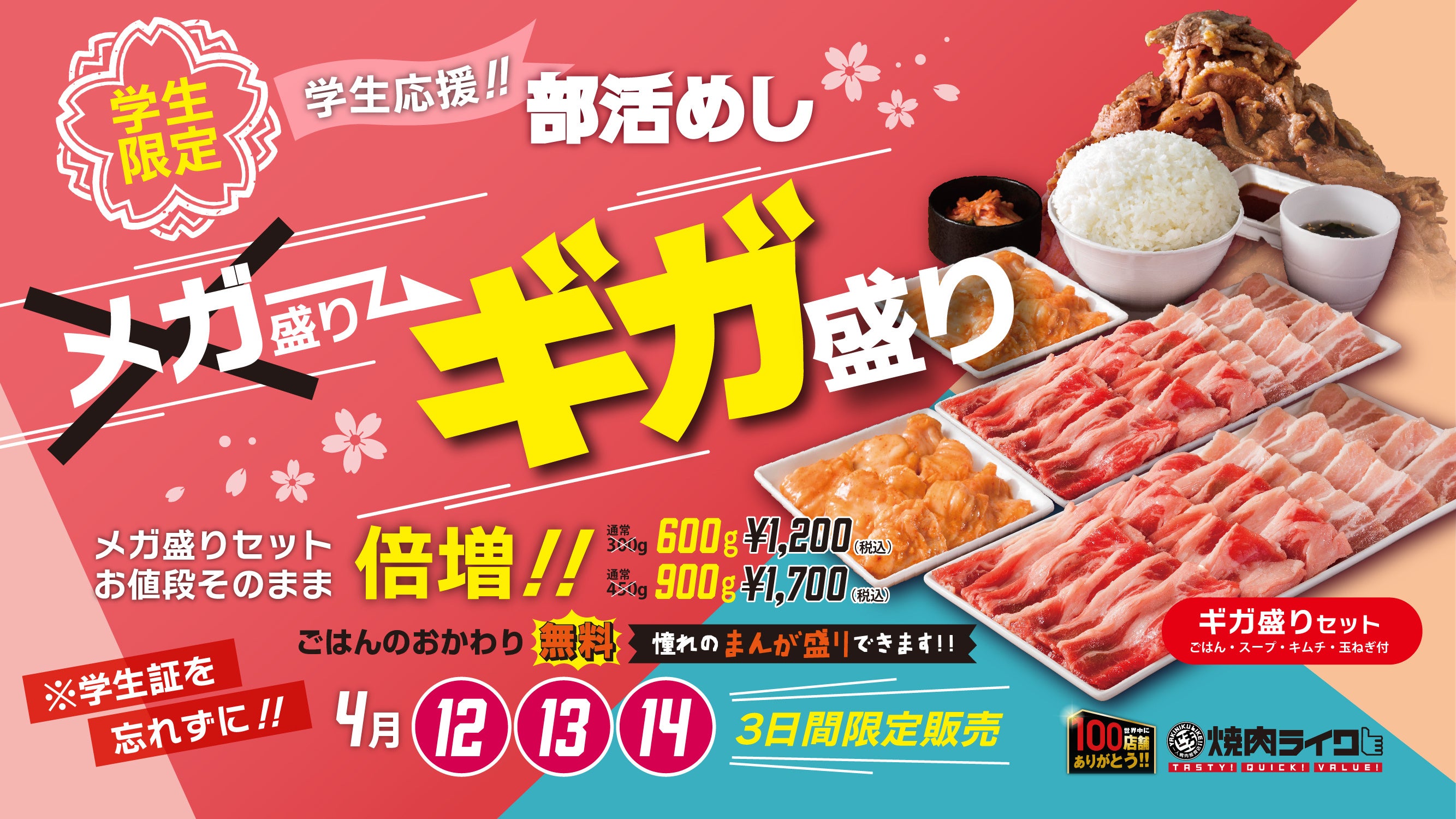 株式会社焼肉ライク(所在地:東京都渋谷区、代表者 有村 壮央)が運営する焼肉のファストフードをコンセプトにした「焼肉ライク」は2022年4月12日(火)~4月14日(木)の3日間、新生活を迎えた学生を応援するキャンペーンを全店舗(柏東口店を除く)で実施します。人気の「メガ盛りセット(300g/450g)」を学生証提示でお値段そのまま、お肉倍量(600g/900g)で提供します。また、渋谷宇田川町店限定で特別メニューを完食したら無料&非売品のふりかけプレゼントのチャレンジ企画も同期間で実施します。新生活で頑張る時こそ、焼肉を好きなだけ食べて、エネルギーチャージをしましょう!