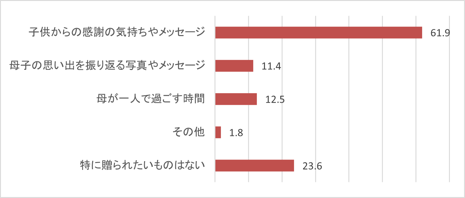 | ■ 母の日には、プレゼント以外にも感謝の気持ちや母の子の思い出を贈ることが重要であることが判明! 母の日に子供から贈られるものとして、プレゼント(有形=形のあるもの)以外に、何があると嬉しいかという問いに、「子供からの感謝の気持ちやメッセージ」の他、「母子の思い出を振り返る写真やメッセージ」や「母が一人で過ごす時間もほしい」と回答するお母さんが多数!子供と同居をしているお母さんにおいても、5割が「子供からの感謝の気持ちやメッセージがあると嬉しい」と回答! |