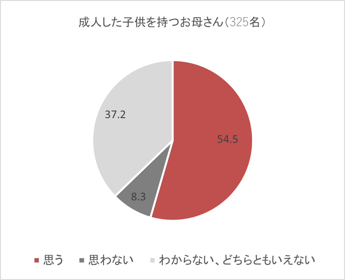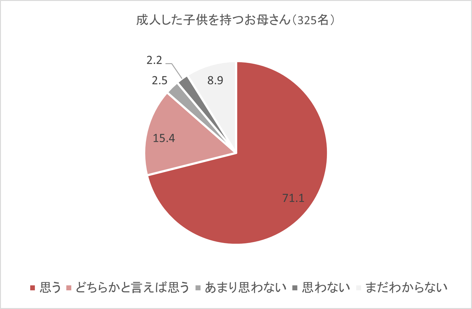 その中でも、成人した子供がいるお母さん(325名)の7割が「思う」と回答。大きくなってもお母さんにとっては子供であり、母の日をきっかけに子供とのコミュニケーションをとりたいと考えている方が多くいることがわかりました。