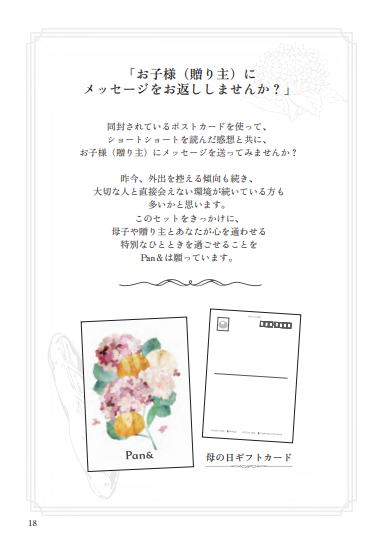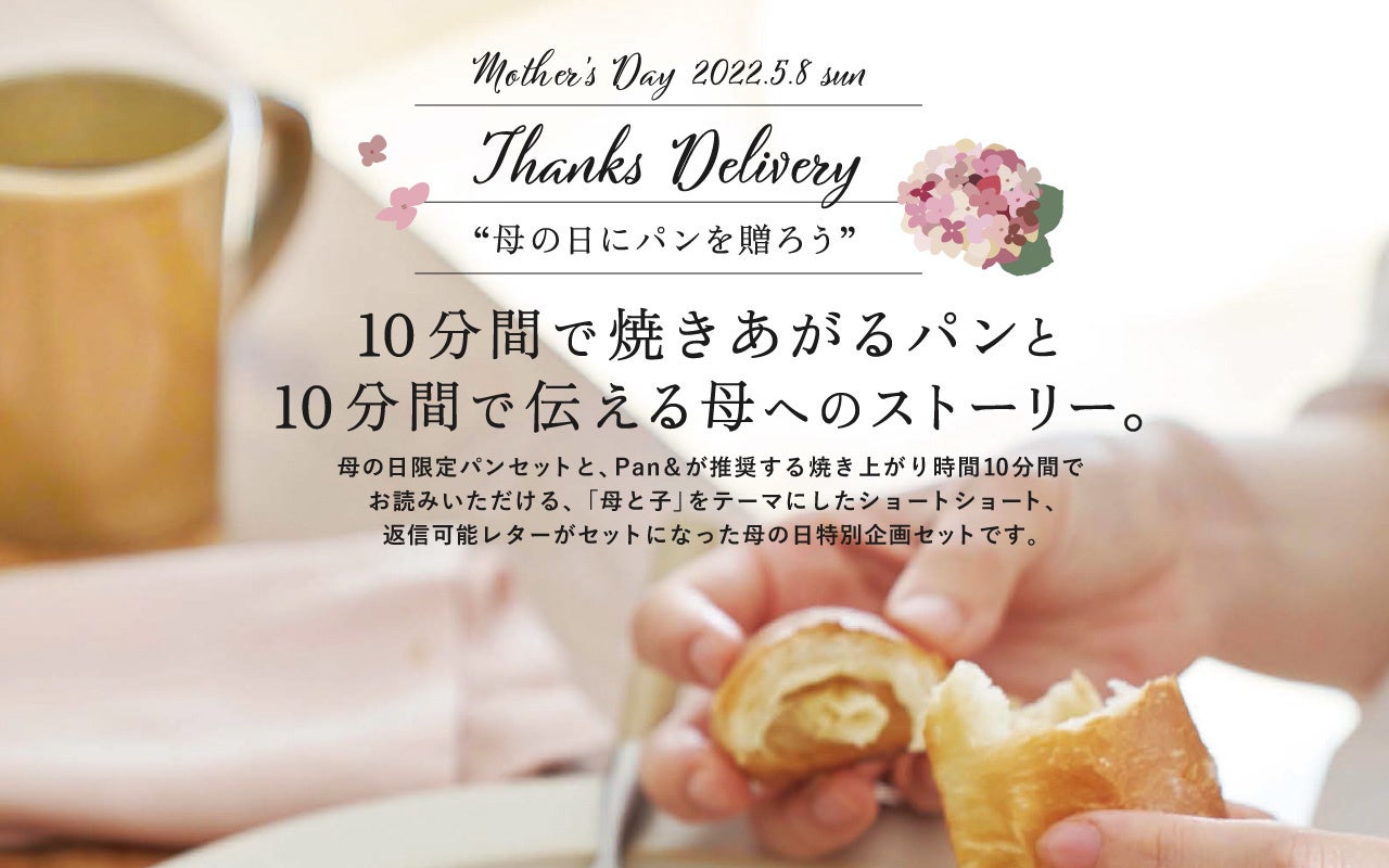 今年の「母の日ギフト」は、『Pan& Thanks Delivery “母の日にパンを贈ろう” 10分間で焼きあがるパンと10分間で伝える母へのストーリー。』をテーマに、『母と子』の想いをつなぐ「特別な同梱物」を贈るプロジェクトを実施。「母の日ギフト」に、Twitterで話題の人気作家が特別に書き下ろした、10分間で読めるショートショートと母と贈り主が思いを通わす返信状をセットにして提供いたします。