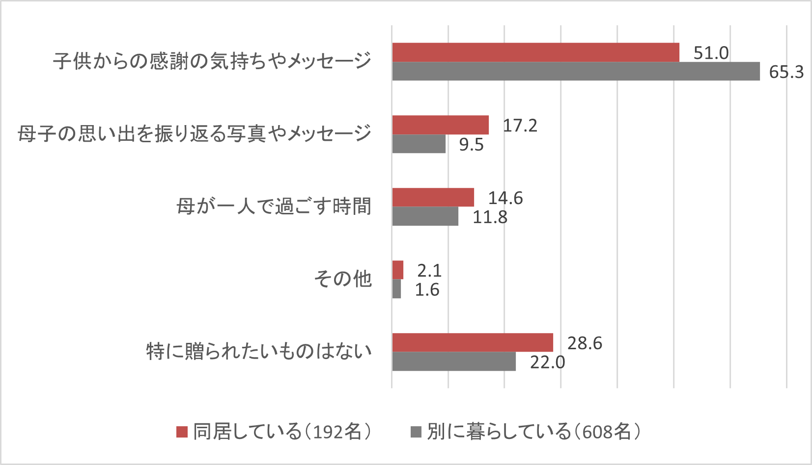 子供と母親のいる女性(800名)に「あなたが母の日にお子様から贈られるものとして、プレゼント(有形=形のあるもの)以外に、何があると嬉しいですか?」と質問をしたところ、「子供からの感謝の気持ちやメッセージ」や「母子の思い出を振り返る写真やメッセージ」「母が一人で過ごす時間」がほしいと回答したお母さんが多数いることがわかりました。また、子供と同居をしているお母さん(192名)の5割が「子供からの感謝の気持ちやメッセージがあると嬉しい」と回答しており、母の日においては、同居の有無に関わらず、特別な日としてプレゼントだけではなく感謝の気持ちや母子の思い出も贈ってほしいと思っているお母さんが多いことがわかりました。