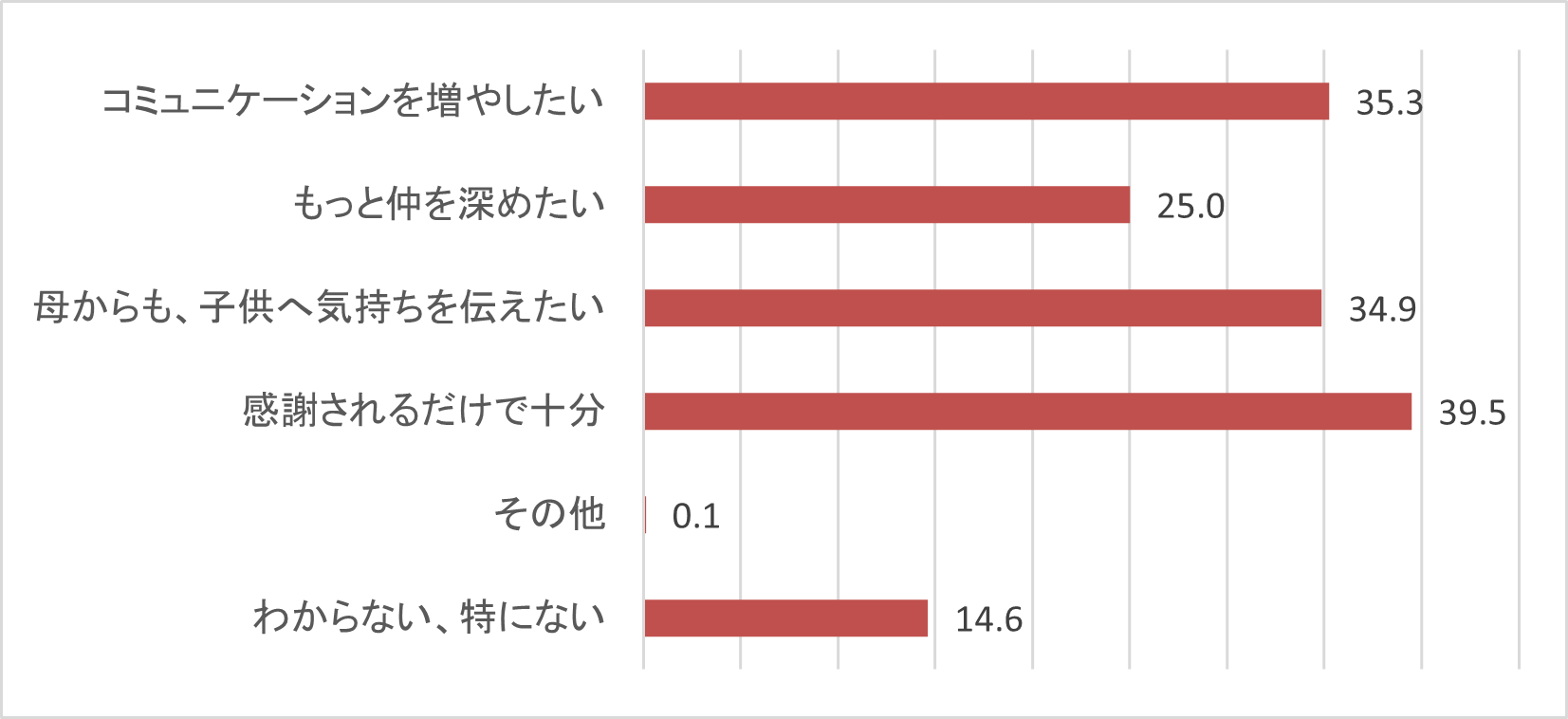 ■母の日をきっかけに子供との関係をどうしていきたいかという問いに、「コミュニケーションを増やしたい」「もっと仲を深めたい」「母からも、子供へ気持ちを伝えたい」と思っているお母さんが全世代に多数いることが明らかに。
