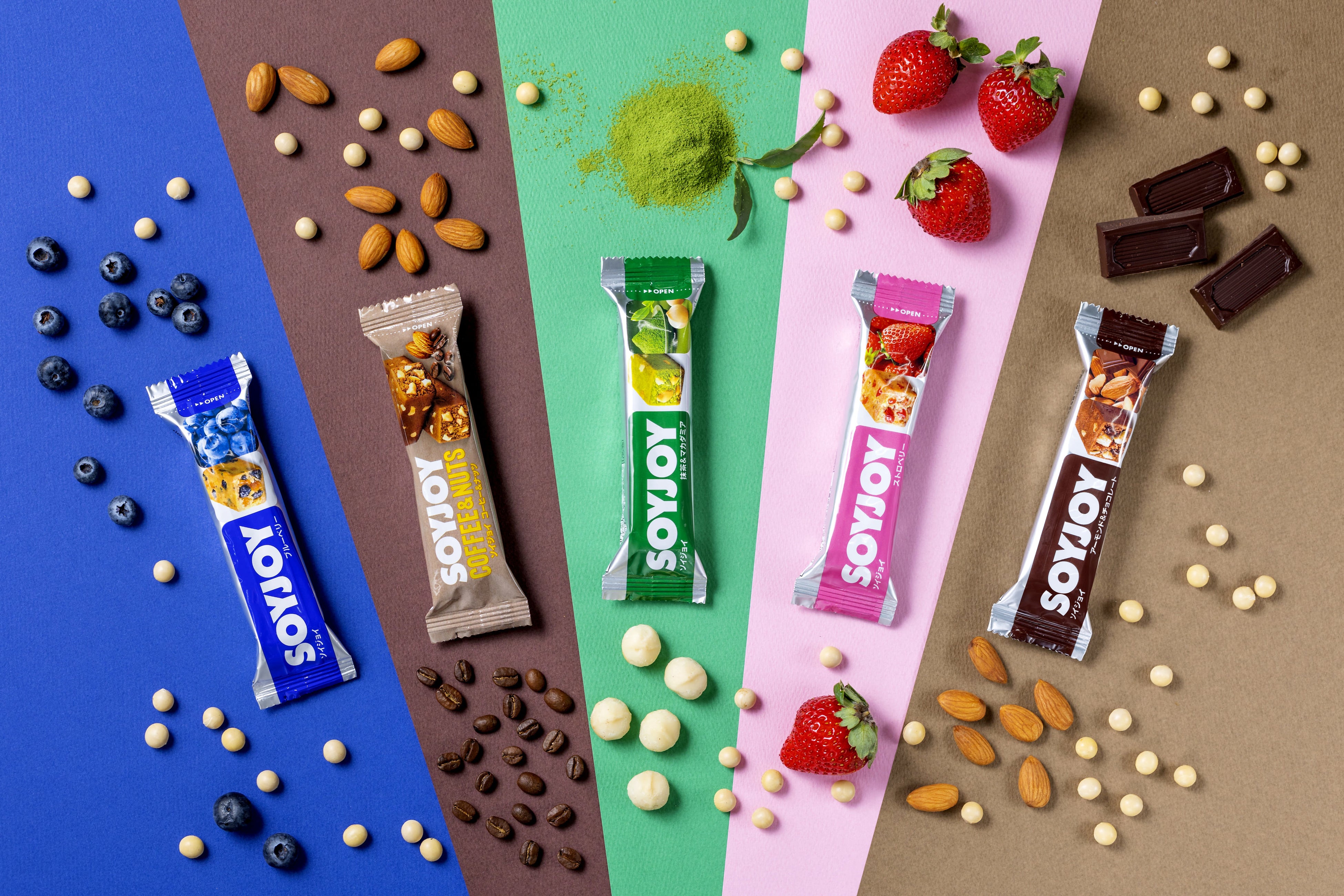 タンパク質や大豆イソフラボンなど素材由来の栄養素を美味しく、いつでもどこでも手軽に食べられる大豆バーとして2006年に誕生。1本当たり約35粒のまるごと大豆と素材の味わいを大切にした低GI食品としてラインアップを拡充してきました。粗びき大豆をアクセントにプレーンスコーン風のしっとりとした食感の「SOYJOY スコーンバー」に続き、このたび「SOYJOY プラントベース」が加わり、全3シリーズで展開しています。