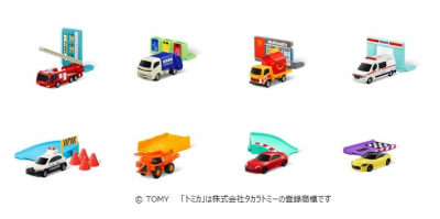 今年も毎年大人気の「トミカ」がハッピーセットに登場します。今回の発達のためのテーマは、図形や空間の認識、人や社会との関わりであり、遊びながら想像力も育みます。第1弾「トミカのまち」では、「救急病院 & 日産 NV400 EV救急車」などの働く車と街のパーツがセットになった全4種、第2弾「トミカの道路」では、スポーツカーが爽快にサーキット道を駆け抜ける「サーキット(ストレート) & 日産 フェアレディZ」など、車と道路のパーツがセットになった全4種とひみつのおもちゃ1種がラインアップ。消防車やスポーツカーなどの多彩な車と、マクドナルドレストランなどの街が作れるパーツや、様々な形の道路のパーツを組み合わせて遊ぶことで、「図形や空間の認識」を育みます。さらに、人や車が行き交う街の情景を思い浮かべ、車を走らせる「ごっこ遊び」を通して「人や社会との関わり」を考え、「想像力」を膨らませる遊びができます。また、第1弾、第2弾の街や道路のパーツを繋げると大きな街になります。自分だけの街を作って車を走らせる遊びが広がります。