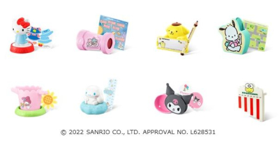 ハローキティやクロミなど、お馴染みのサンリオキャラクターたちと幅広い遊びが楽しめる「サンリオキャラクターズ」もハッピーセットに登場します。今回の発達のためのテーマは、言語、図形や空間の認識、そして自然科学です。第1弾では、洋服の着せ替えシールを自由に貼って楽しむ「ハローキティ きせかえスタンプ」などの全4種、第2弾では、アルファベットで遊べる「クロミ ABCカード」など全4種とひみつのおもちゃ1種がラインアップ。アルファベットや英語に親しみ、「言語」で遊ぶカードのおもちゃや、物の長さを測る遊びを通して「図形や空間」の認識を高めるおもちゃ、惑星や星座への興味を引き出す「自然科学」のおもちゃがあります。遊びながら多様な領域への関心を深めることができます。
