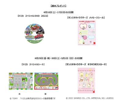 4⽉16⽇(⼟)・17⽇(⽇)の2⽇間は、ハッピーセット「トミカ」を1セットご購⼊につき「トミカ スペシャルDVD 2022」を、ハッピーセット「サンリオキャラクターズ」を1セットご購⼊につき「サンリオキャラクターズ メッセージシール」をプレゼントいたします。さらに、4⽉29⽇(金・祝)・30⽇(土)・5月1日(日)の3⽇間は、ハッピーセット「トミカ」を1セットご購⼊につき「トミカ スペシャルシート」を、ハッピーセット「サンリオキャラクターズ」を1セットご購⼊につき「サンリオキャラクターズ キラキラポストカード」をプレゼントいたします。