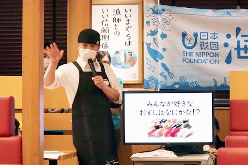 スシロー先生こと、あきんどスシロー営業課長の清水大輔さんは、安定しておいしい魚を提供するためには養殖も大切であると話し、ハマチの養殖について動画などを使って解説。また、ハマチは出世魚と呼ばれ、成長するにつれて名前が変わりますが、その名前は地域によっても違うことを紹介しました。