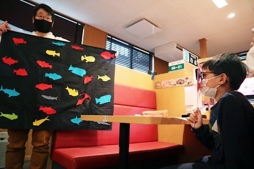 回転すしのレーンが並ぶスシローの店舗が、教室に早変わりです。