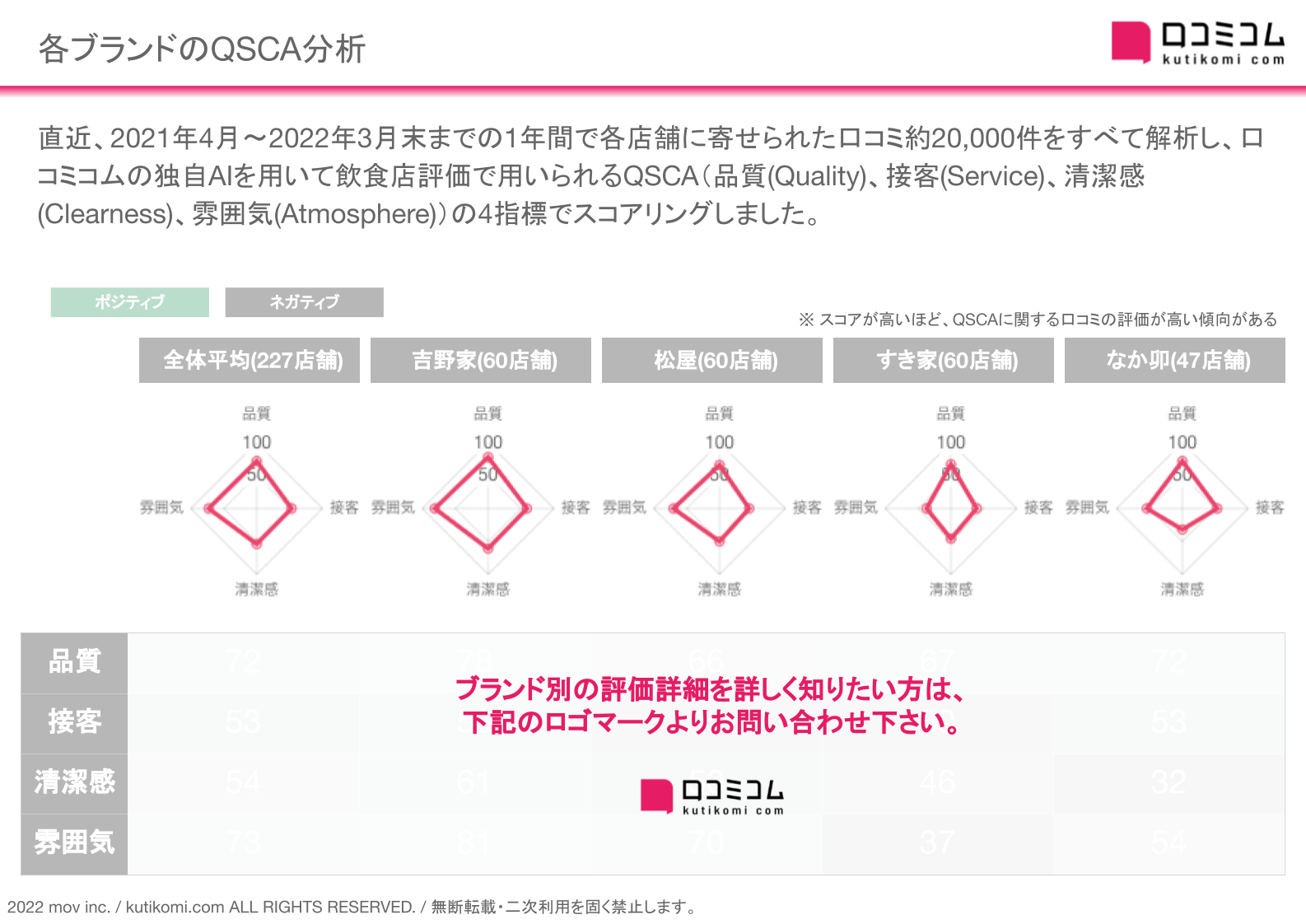 また、直近1年間(2021年4月~2022年3月末)で各店舗に寄せられた口コミ約20,000件を解析し、口コミコム独自のAIを用いてQSCA分析を行いました。