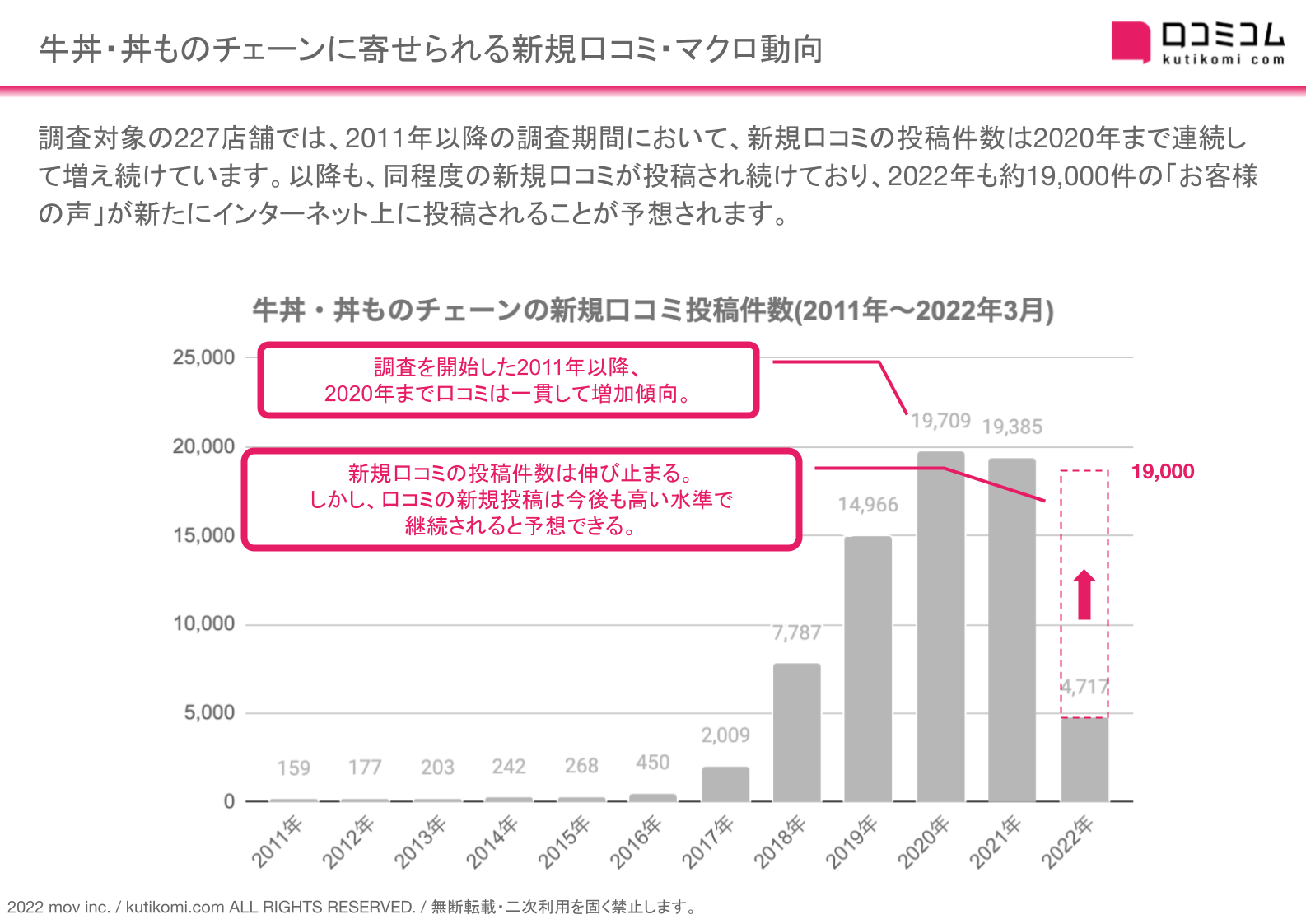 調査対象の227店舗では、2011年以降の調査期間において、新規口コミの投稿件数は2020年まで一貫して増加し続けています。今後も高い水準での投稿件数は継続されると予想されます。