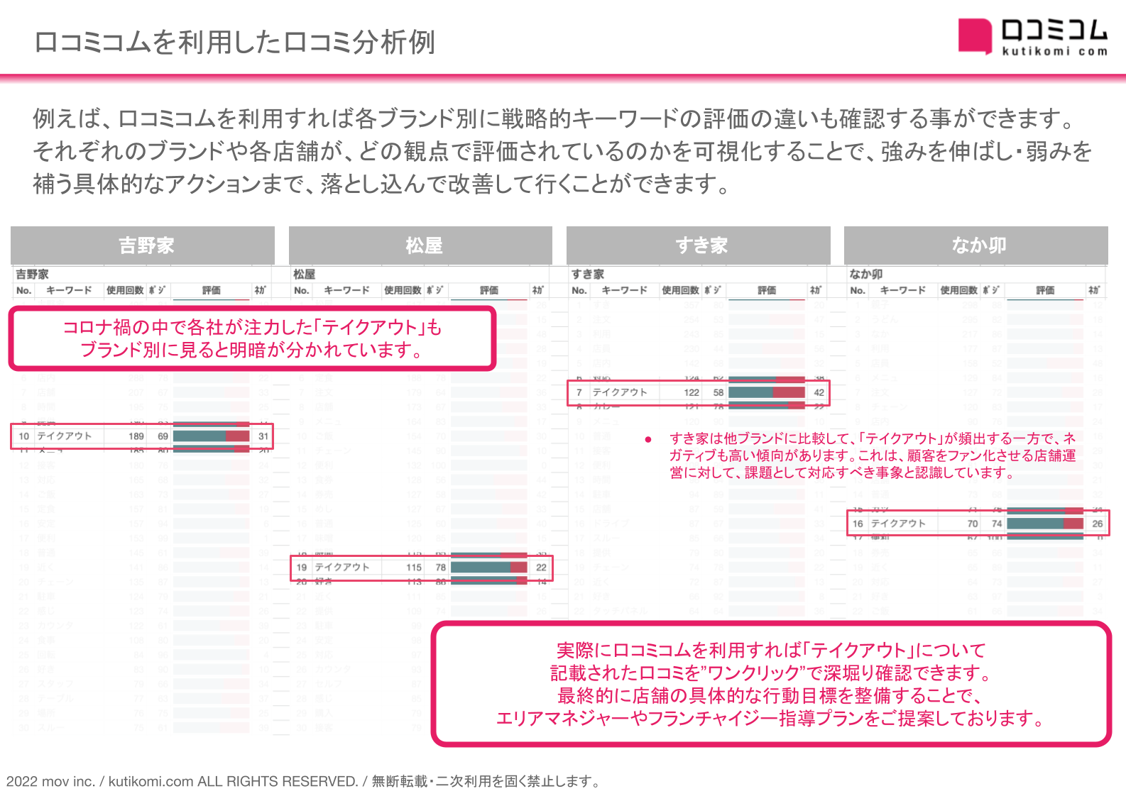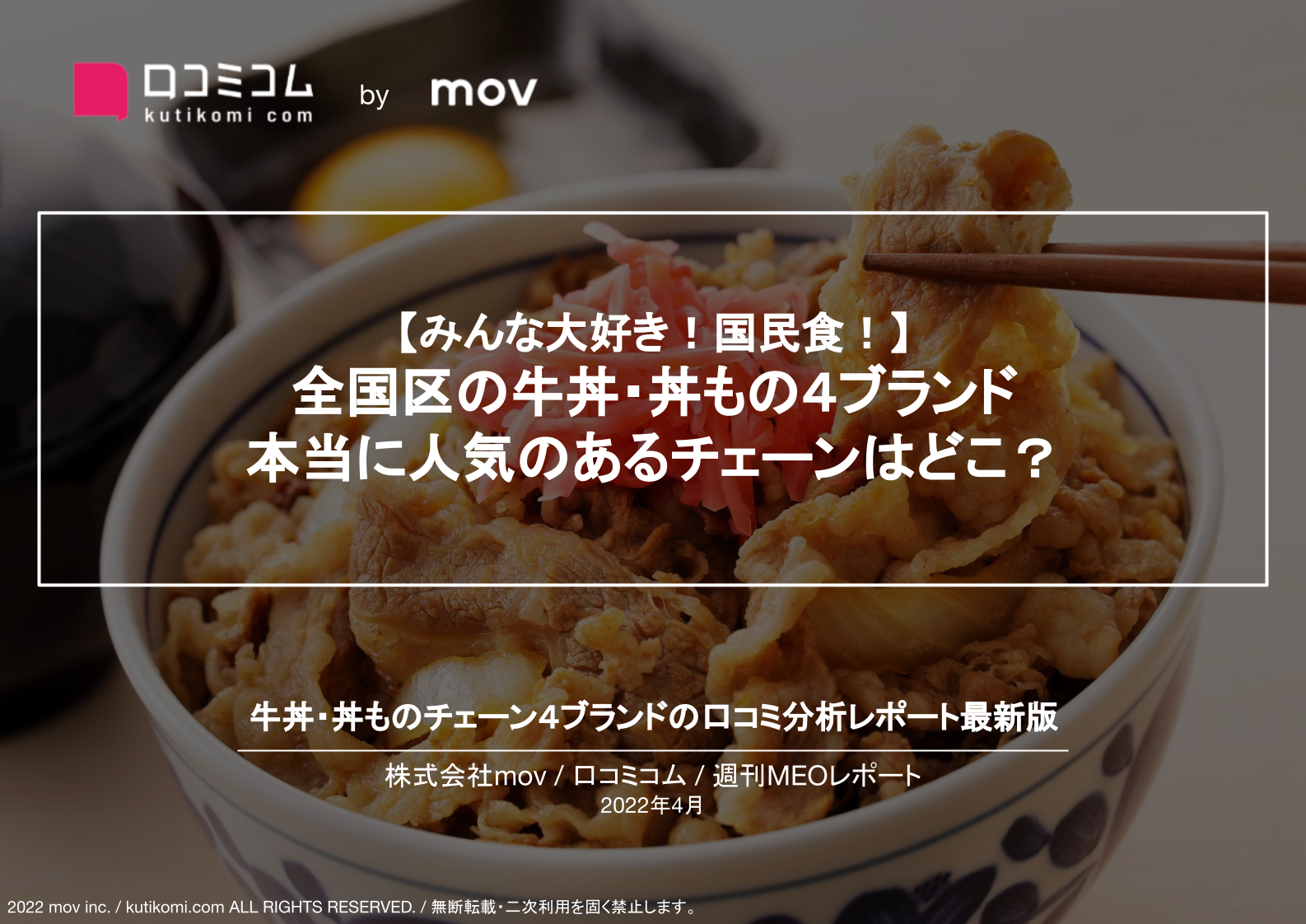 お客様の声のDXサービス「口コミコム」を運営する株式会社mov(代表取締役:渡邊 誠、本社:東京都渋谷区、以下mov)は、「口コミコム」独自の「分析機能」を用い、「牛丼・丼ものチェーン4ブランド」の口コミ分析レポートを作成しました。