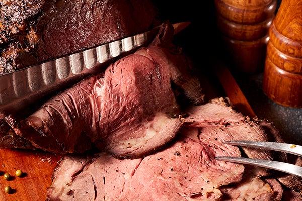 お客さまの目の前でカッティングサービスをさせていただきます。じっくりと焼き上げたローストビーフは大人気メニューです。爽やかな香りと辛味が特徴の北海道産山わさびと一緒にぜひご賞味ください。