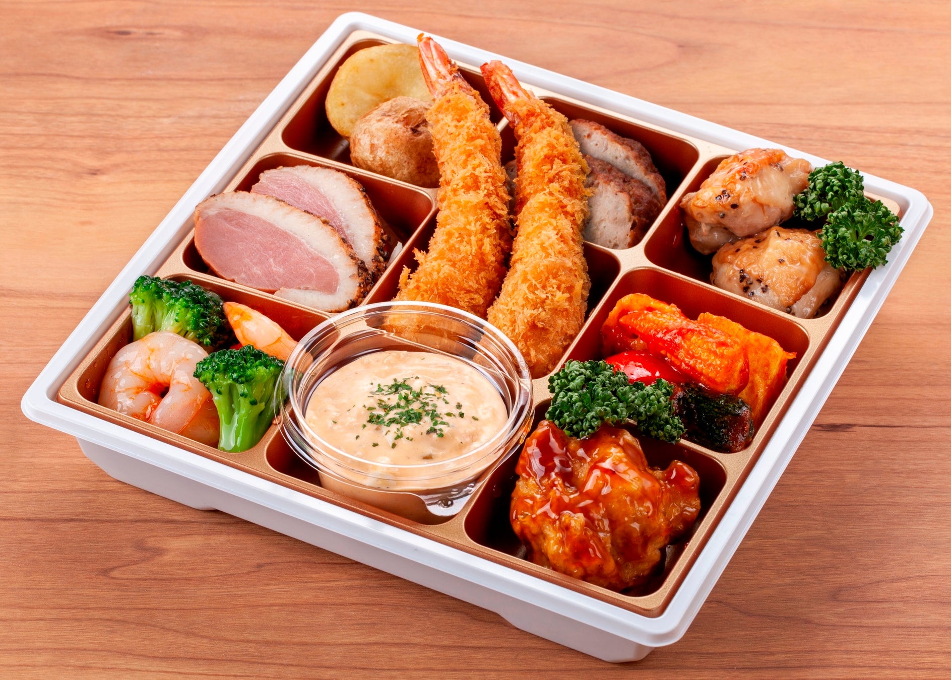 北海道産キタアカリのフライ/ミートローフ/レモンペッパーチキン(若鶏)/キャロットラぺ/鴨の燻製パストラミ/海老フライ/ラタトゥイユ/海老とブロッコリーのガーリック炒め/若鶏のチキン南蛮/タルタルソース