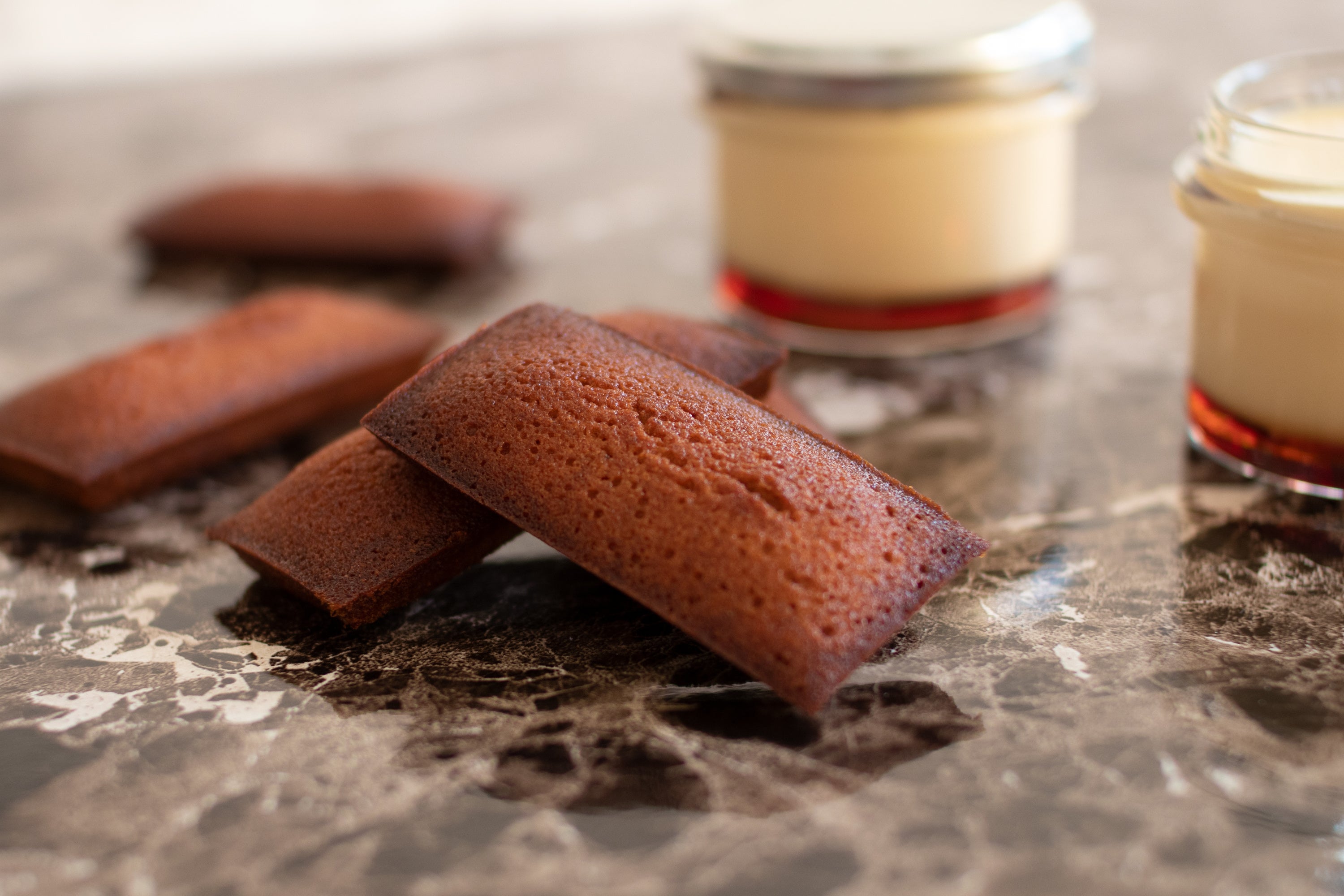 和菓子の製造も行っていたナショナルデパートは、長年「菓子の口溶け」を研究する中で見つけた「糖」の加熱による食感の演出を活かすためにこのフィナンシェを開発しました。焦がしバターの効いた生地の外側のガリっとサクッとのちょうど間の食感に、ジュワに近い感じでアーモンド生地が舌の上にひんやり感じます。