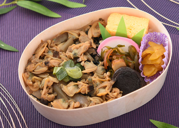 ・江戸甘味噌と生姜であっさり仕上げた「あさりの深川煮」と、香り豊かな「牛蒡の炒り煮」をあさりの旨みを炊き込んだ茶飯に盛り込みました。