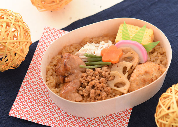 ・「軟骨入り鶏つくね」「鶏そぼろ味噌味」「鶏照焼き」「蒸し鶏塩ダレ和え」の四種の味を、甘めに炊き上げた「鶏だしごはん」に盛付けました。