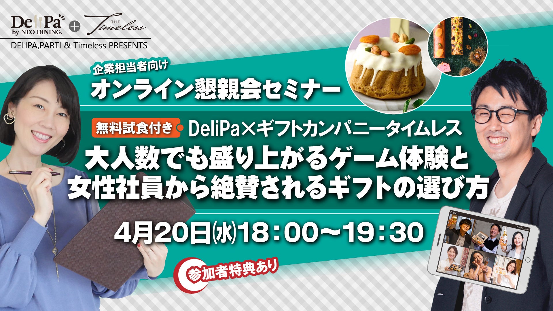 業務提携後のサービス第一弾として、「《DeliPa×タイムレス社合同》オンライン懇親会ゲーム体験&ギフトの選び方オンラインセミナー」の実施が決定しました。コロナ禍の社内コミュニケーション不足に悩む企業に寄り添い、課題解決のお手伝いをいたします。