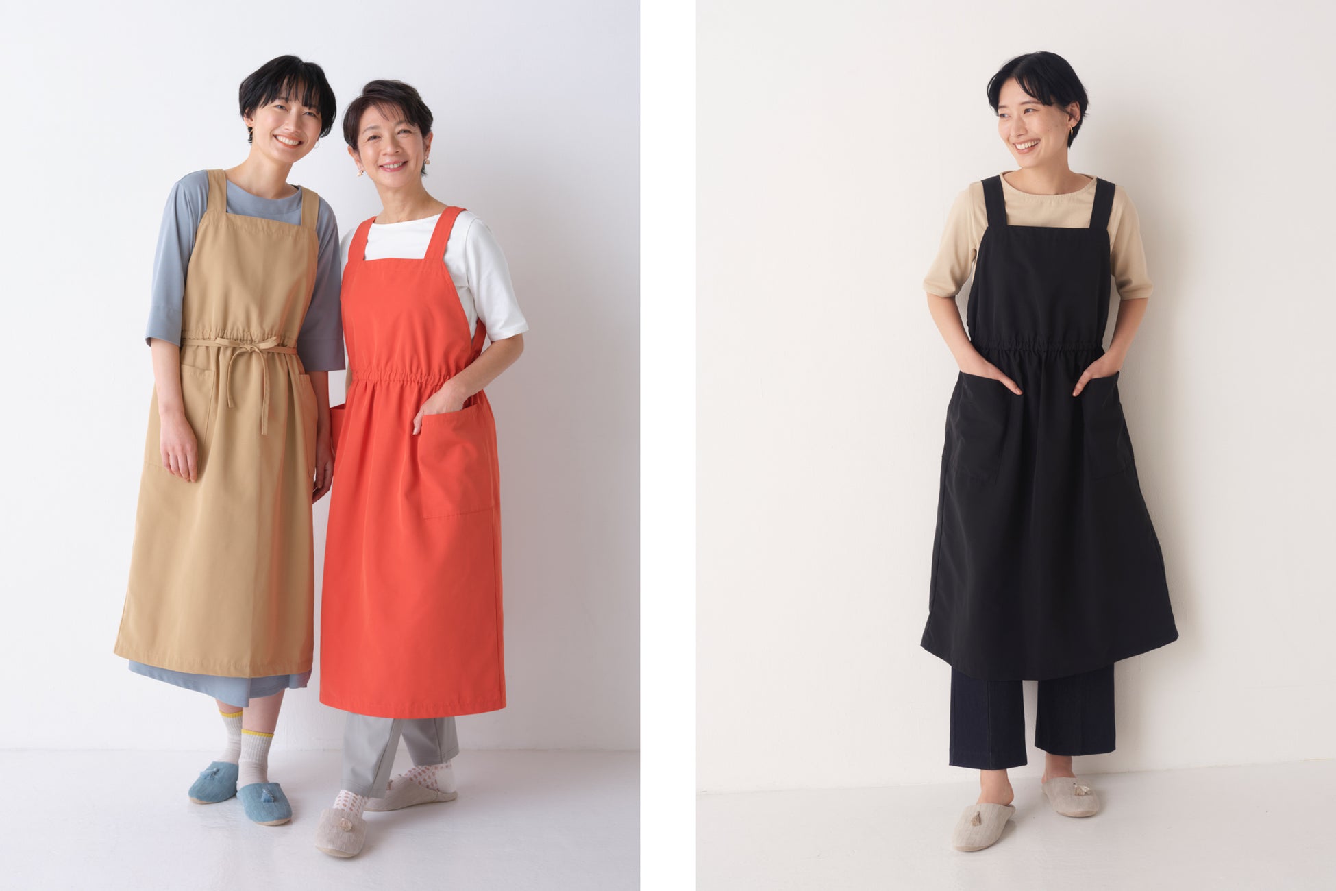 「暮らしに”効く”衣服」を目指すKEYUCAのアパレルラインでは、消臭・抗菌防臭・食品防汚という機能性と、羽織ったままでコンビニやスーパーなどへ買い出しに行けるファッション性を兼ね備えたエプロンを企画。毎日清潔にしていたいエプロンだから、ご自宅の洗濯機で洗えて、シワになりにくく、乾きやすいイージーケアにもこだわりました。幅のある肩ひもがズレ落ちにくく、スマホや小物を出し入れしやすい大きなポケット付き。ウエストギャザー部分のひもでサイズ調整ができ、高めのウエスト位置がスタイルアップして見せてくれます。ひもは前後どちらでも結べる2WAYです。エプロンと同素材で作った付属の巾着袋は、ギフト映えするだけでなく、持ち運びに便利で、機能的なエコバッグやバッグインバッグとしても活躍します。